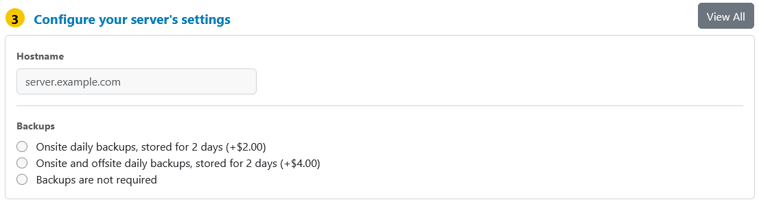 Here you will define your server's name, add a backup plan, or add additional features to your server if available: