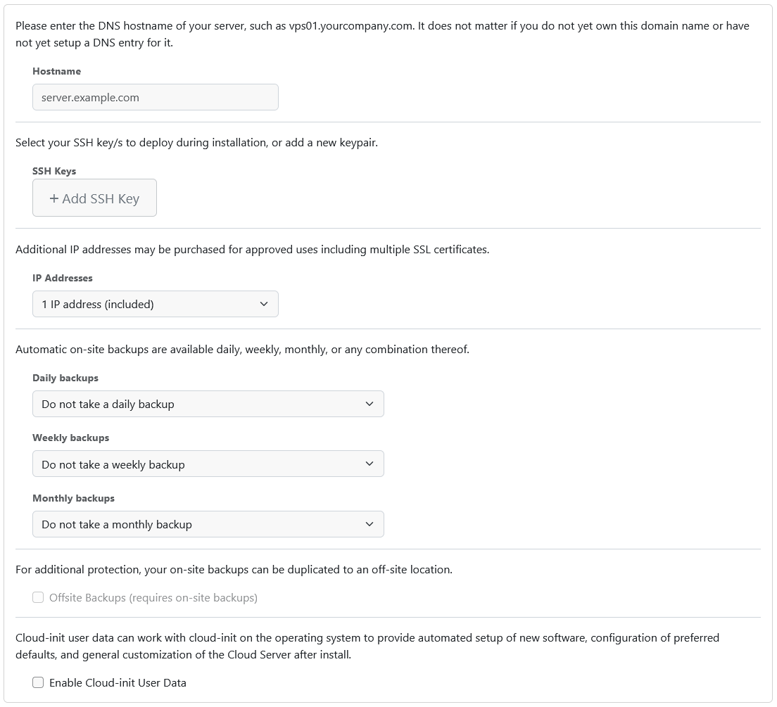 - Enabling the Enable Cloud-init User Data option allows you to define a cloud-init script for the Cloud-config service to use during initial server creation. This script automates first-boot setup using YAML, handling tasks such as package installation, service configuration, and user management on supported Linux distributions (e.g., Ubuntu, AlmaLinux 8+, Rocky Linux 8+). More details on this feature can be found here: Cloud-config for Linux servers