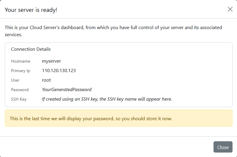After you've signed up successfully, your server will begin creation. Once the server has been created and is online, you'll be taken to your server's dashboard, and your connection details will be displayed: